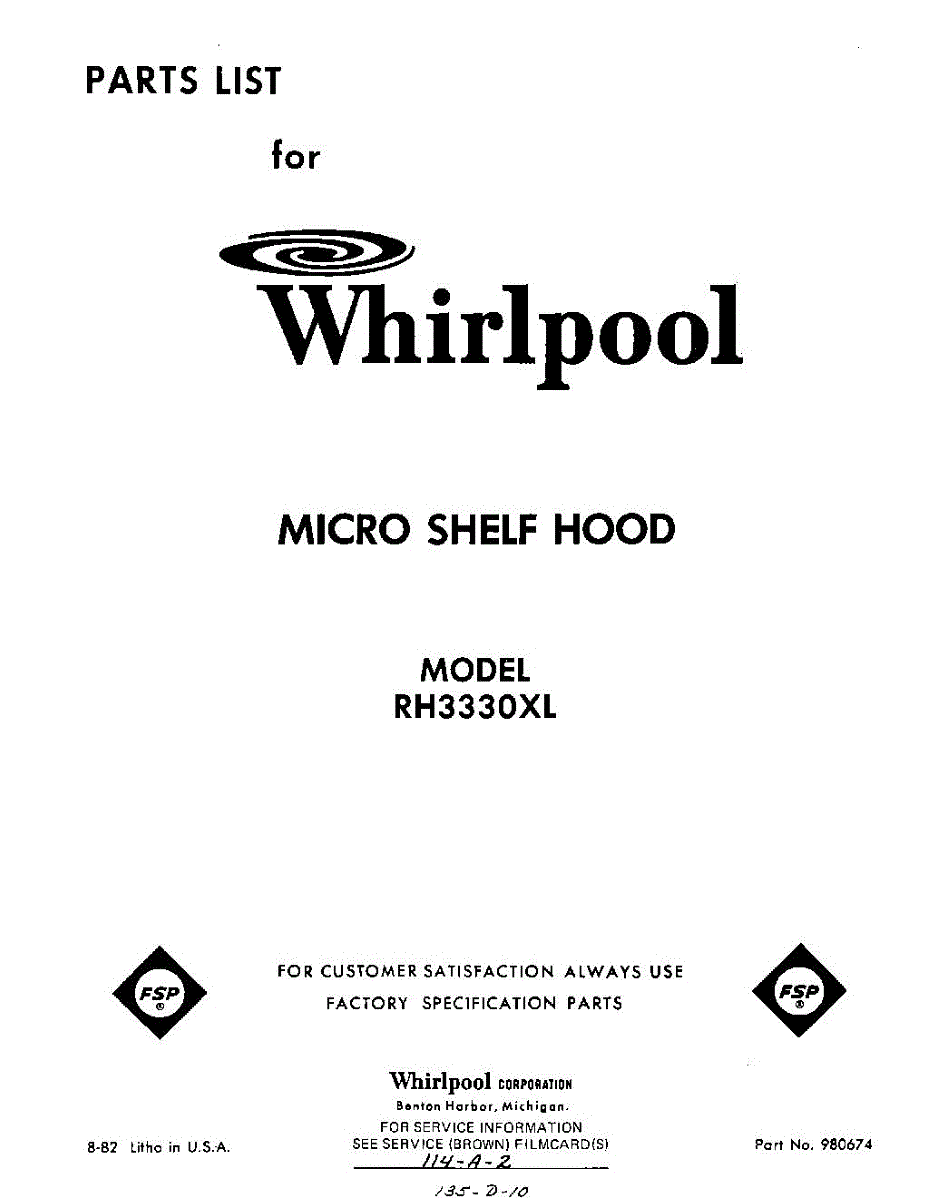 Parts for Whirlpool RH3330XL: 01 - Section Parts