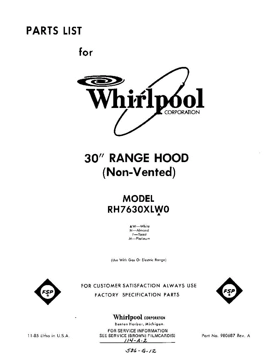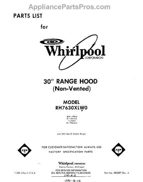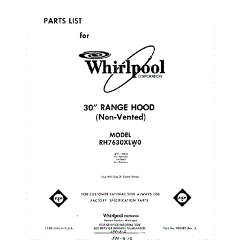 Parts for Whirlpool RH7630XLW0: 01 - Section Parts
