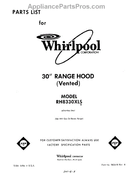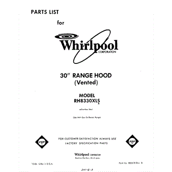 Parts for Whirlpool RH8330XLS: 01 - Section Parts