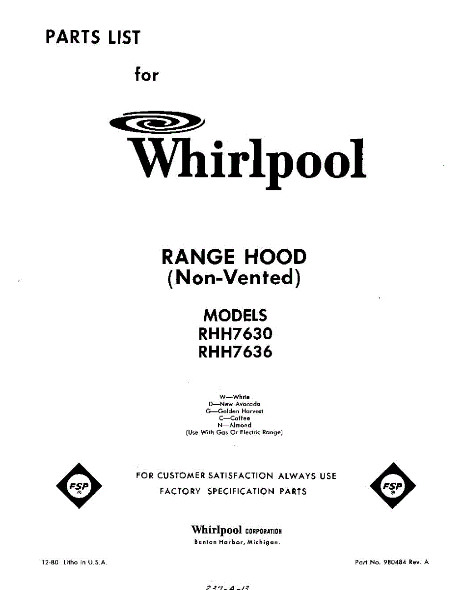 Parts for Whirlpool RHH7630: 01 - Section Parts