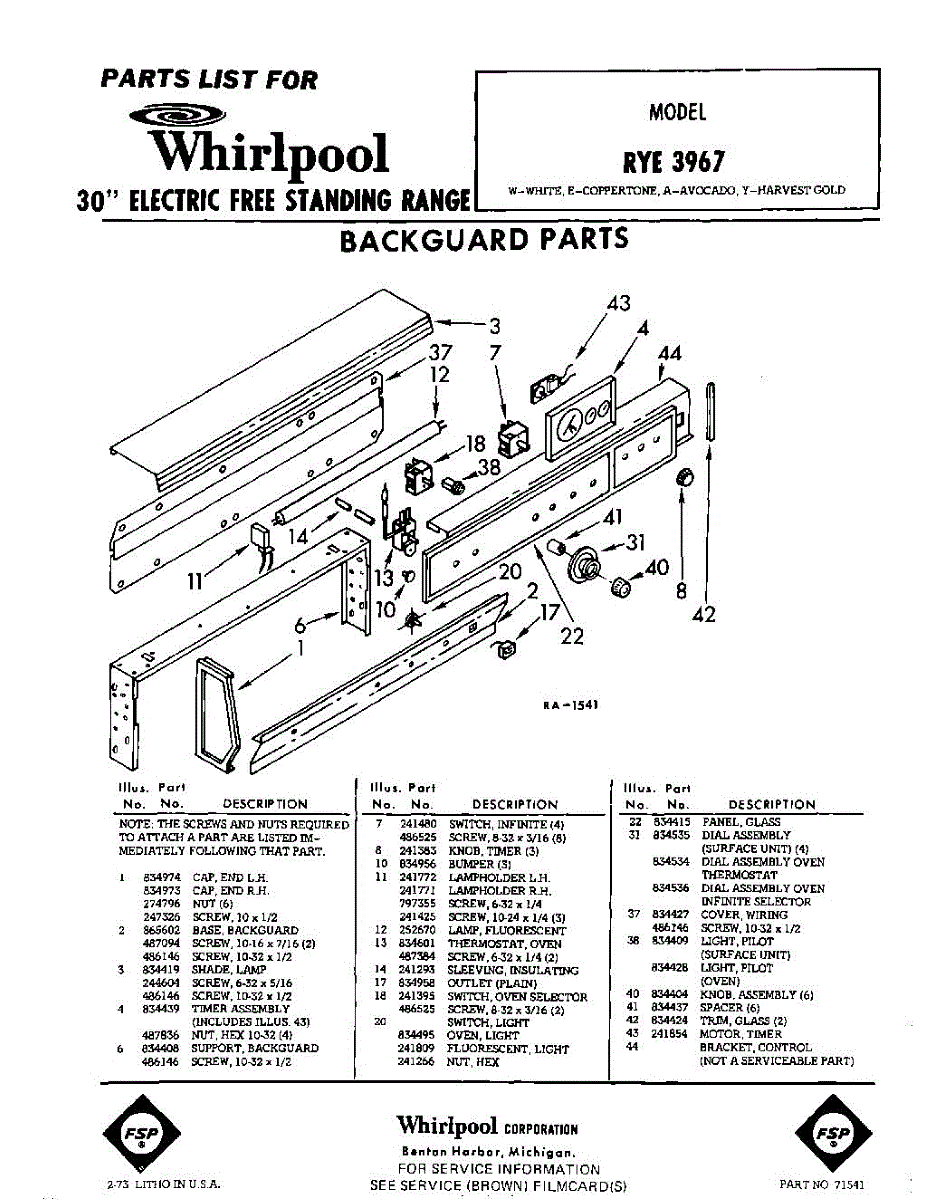 Parts for Whirlpool RYE3967: 01 - Section Parts