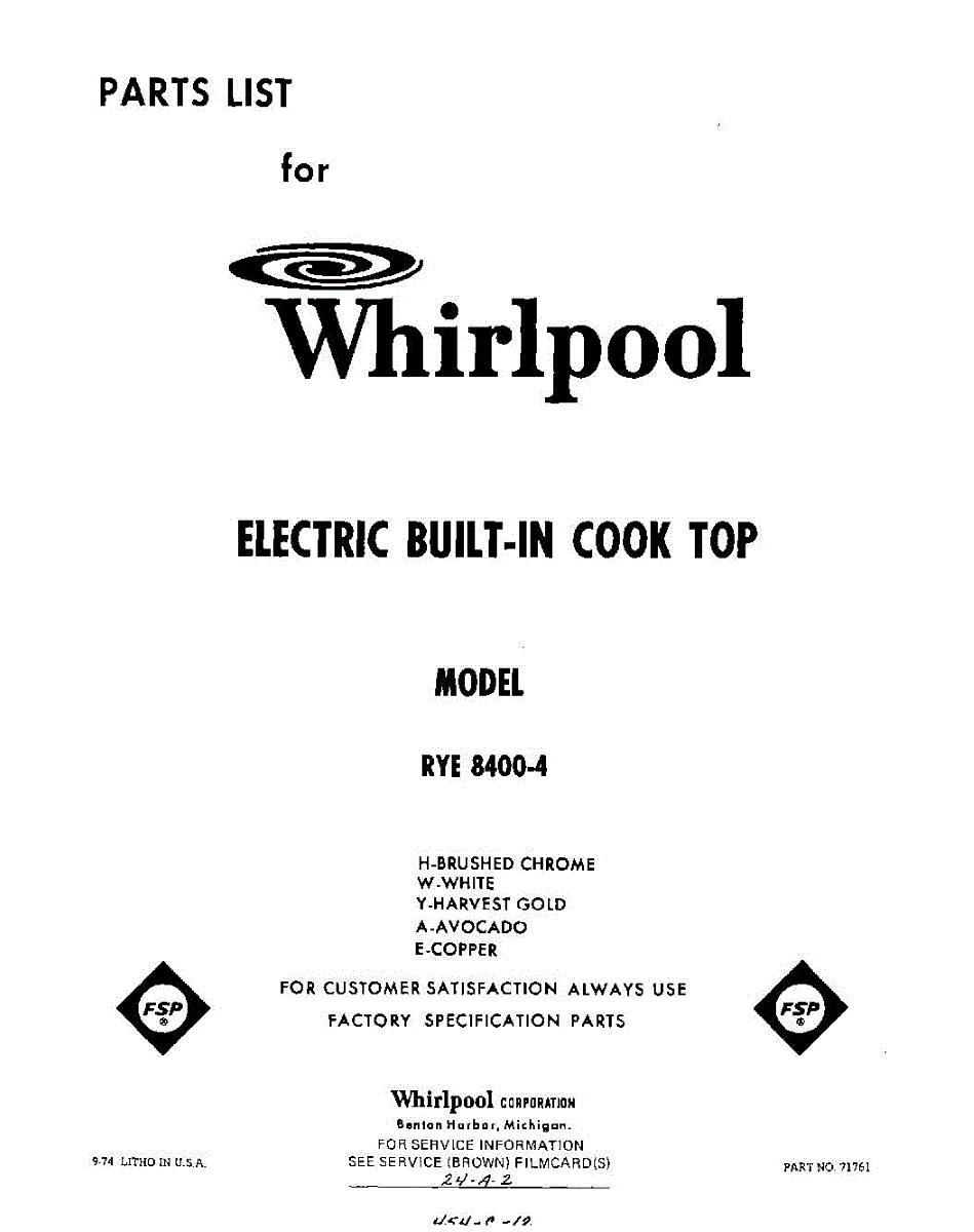 Parts for Whirlpool RYE8400W4: 01 - Section Parts