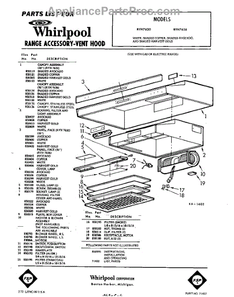 Parts for Whirlpool RYH7630: 01 - Section Parts