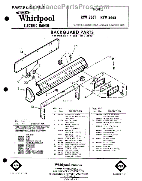 Parts for Whirlpool RYV3665: 01 - Section Parts