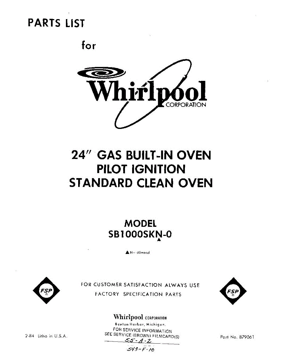 Parts for Whirlpool SB1000SKN0: 01 - Section Parts
