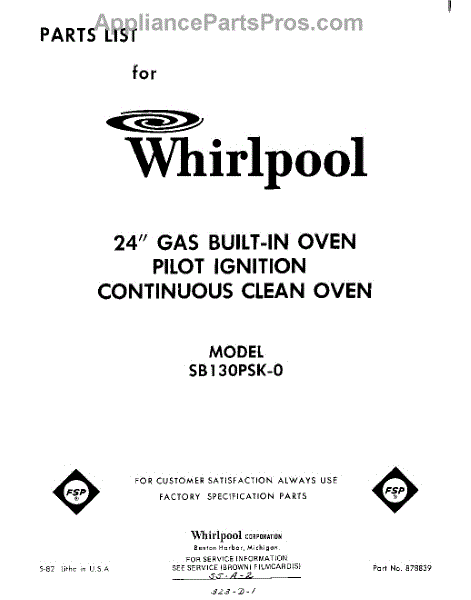 Parts for Whirlpool SB130PSK0: 01 - Section Parts