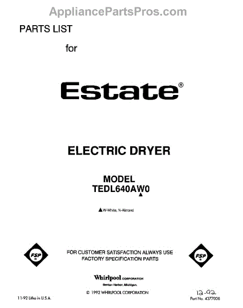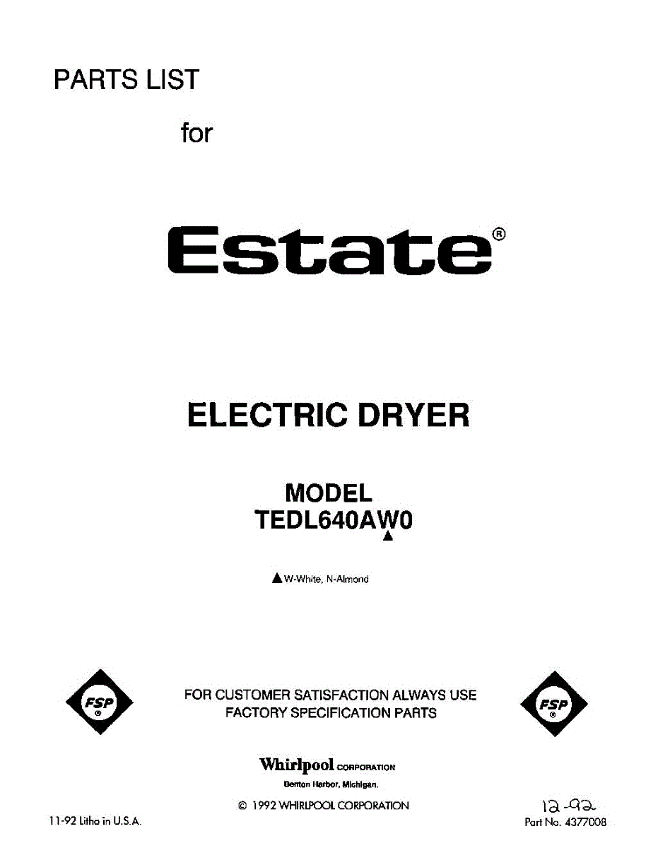 Parts for Whirlpool TEDL640AW0: 01 - Section Parts