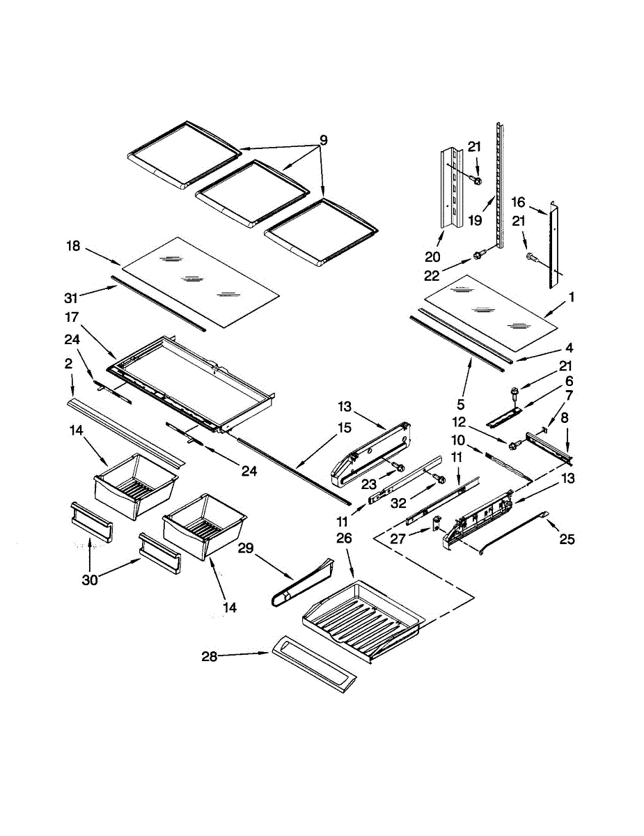 Glass shelf for bottom-mount refrigerators. Mounts on side ladder brackets inside fresh food compartment. Replace if cracked, broken, or missing.
