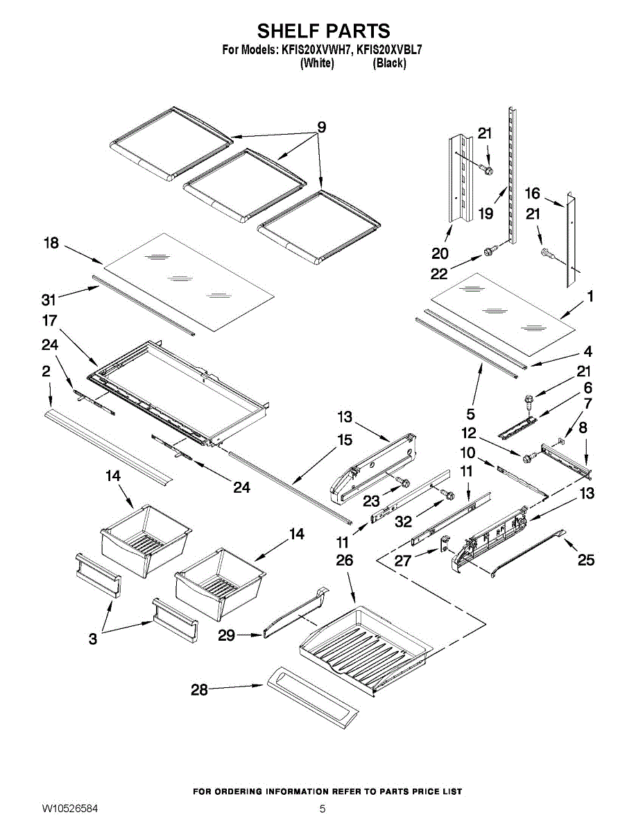 Glass shelf for bottom-mount refrigerators. Mounts on side ladder brackets inside fresh food compartment. Replace if cracked, broken, or missing.