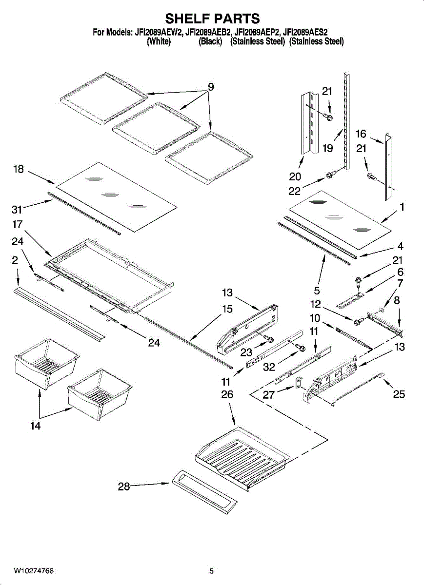Frame that covers produce drawers and supports shelf glass. Replace if cracked, warped, or broken to restore flat surface and smooth drawer gliding.