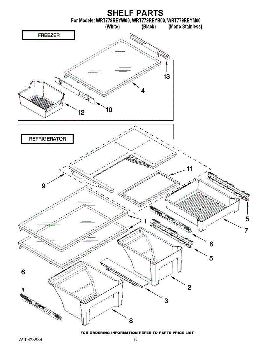 Cantilever shelf with flip-up front section for refrigerator fresh food compartment. Replace cracked, broken, or worn shelves to restore storage space.