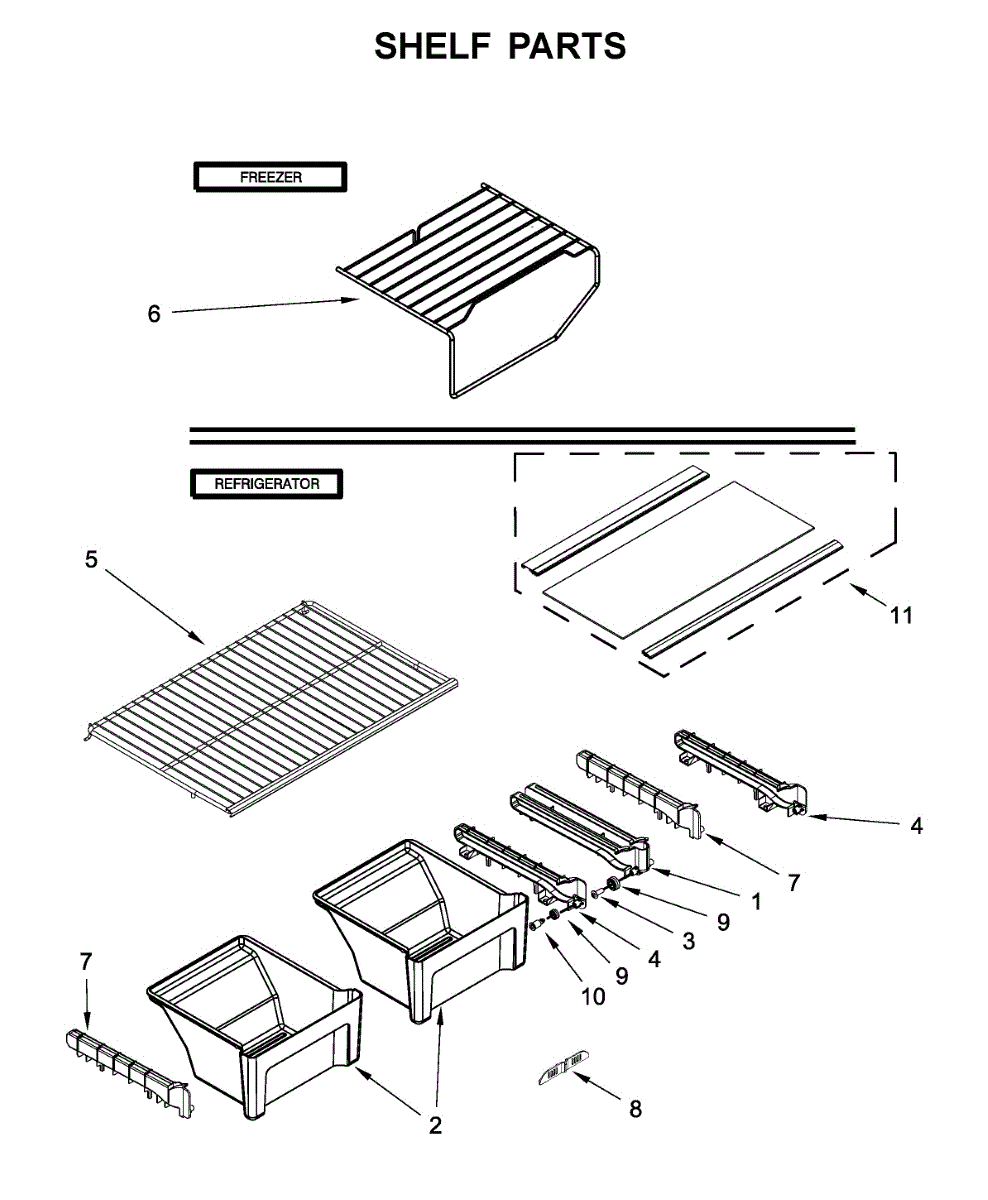 • Lift old shelf straight up/out of the support tracks; slide new shelf into the same tracks until seated