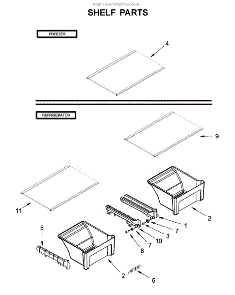 Full-width shelf assembly that restores a stable storage surface in the refrigerator fresh-food compartment. Replaces cracked, warped, or missing shelves to keep food and containers organized and supported. What it does: