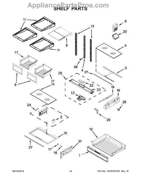 The Storage Drawer is an OEM replacement part for Whirlpool refrigerators. It provides customizable organization for items like snack foods, beverages, and condiments inside the refrigerator cabinet. The drawer measures approximately 27"x 20"x 6". Causes of a bad storage drawer can include broken mounting slides, making it difficult to open or close securely. Overpacking may also cause cracks in the plastic construction over time. Symptoms of a bad storage drawer include: