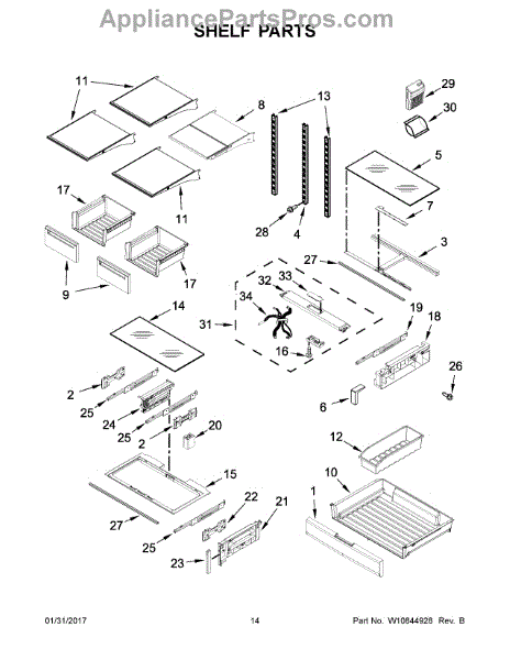 The Storage Drawer is an OEM replacement part for Whirlpool refrigerators. It provides customizable organization for items like snack foods, beverages, and condiments inside the refrigerator cabinet. The drawer measures approximately 27"x 20"x 6". Causes of a bad storage drawer can include broken mounting slides, making it difficult to open or close securely. Overpacking may also cause cracks in the plastic construction over time. Symptoms of a bad storage drawer include: