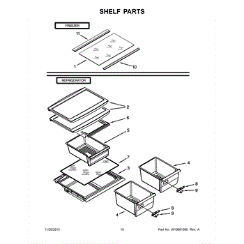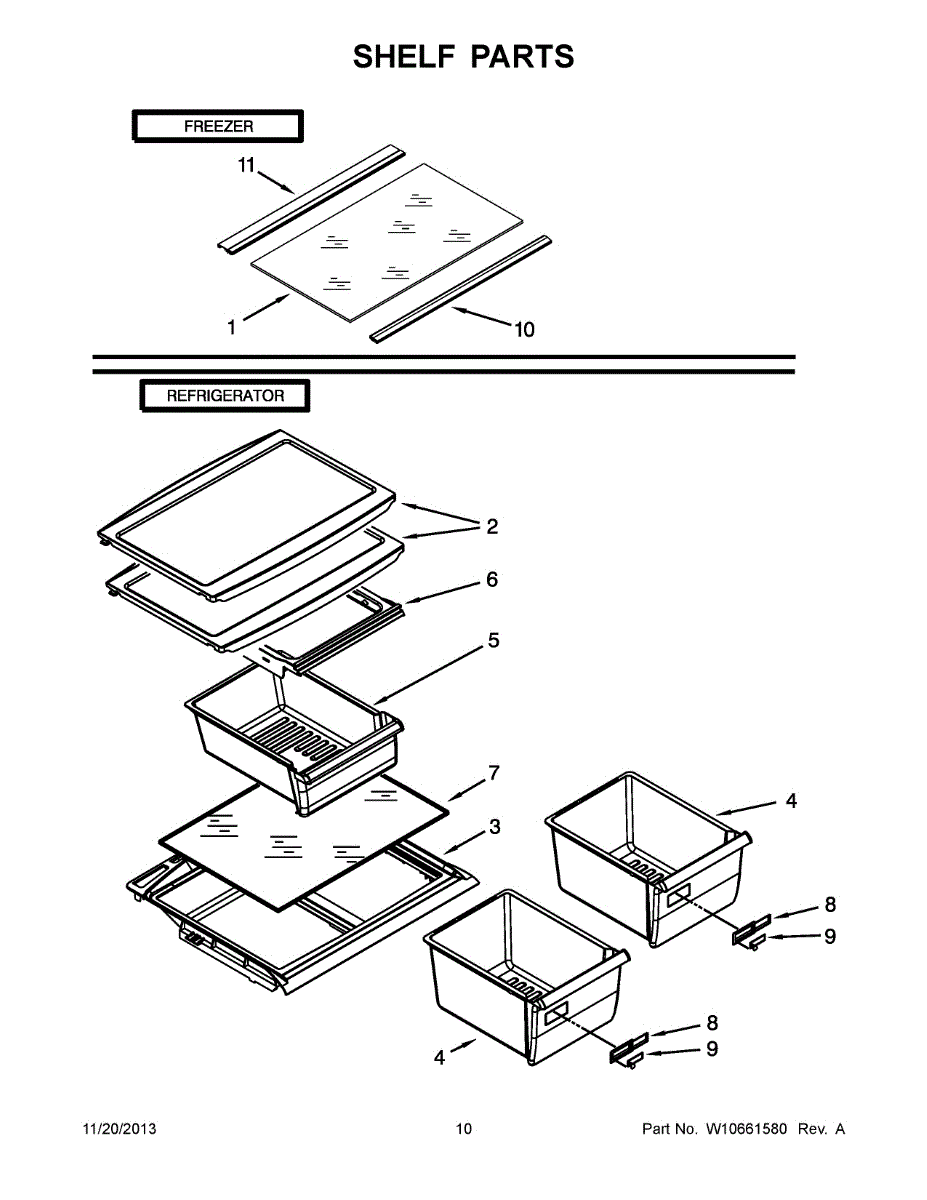 Plastic frame that holds the glass shelf above crisper drawers. Replace if cracked, broken, or damaged from weight or impact. Frame only, glass sold separately.