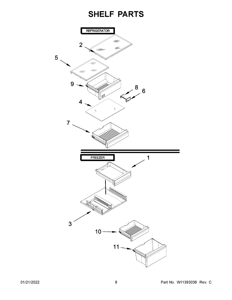 Storage container for bottom-mount refrigerators. Installs inside fresh food compartment. Replace if cracked, broken, or missing to organize food items.