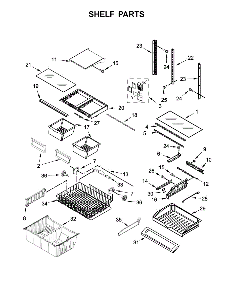 Frame that covers produce drawers and supports shelf glass. Replace if cracked, warped, or broken to restore flat surface and smooth drawer gliding.