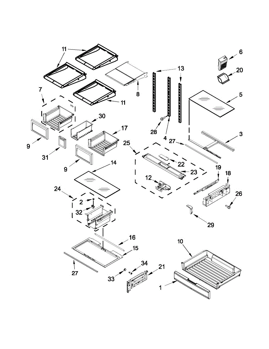 Plastic frame that supports the glass shelf above refrigerator crisper bins and forms drawer slide tracks. Replace if cracked, broken, or missing.