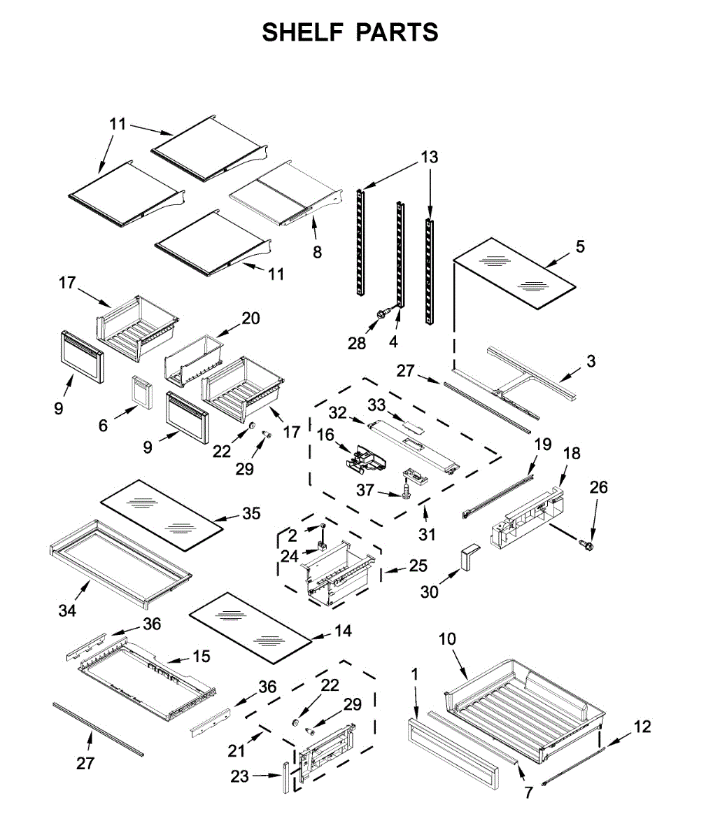Interior glass shelf for bottom-mount refrigerators. Replaces cracked, broken, or missing shelves to restore usable storage space in your fridge.