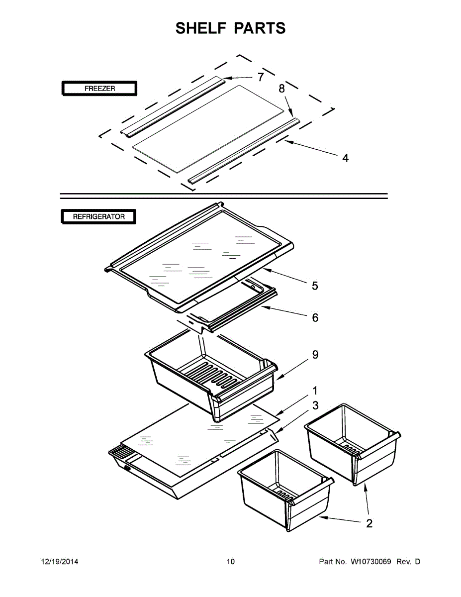 Causes of a bad glass shelf can include chips or cracks developing from normal use and repeated door openings/closings over time. Accidental impact damage is also possible.