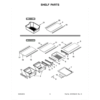 Full-width shelf assembly that restores a stable storage surface in the refrigerator fresh-food compartment. Replaces cracked, warped, or missing shelves to keep food and containers organized and supported. What it does: