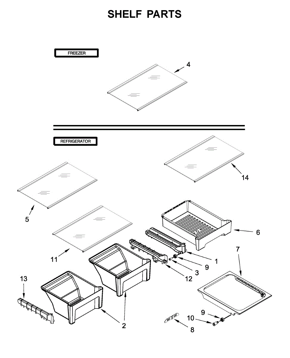 Full-width shelf assembly that restores a stable storage surface in the refrigerator fresh-food compartment. Replaces cracked, warped, or missing shelves to keep food and containers organized and supported. What it does: