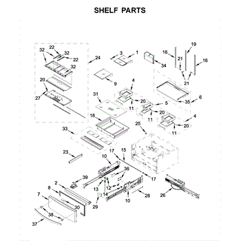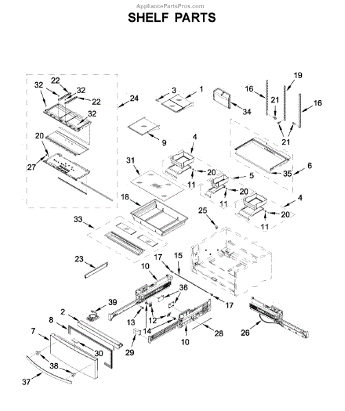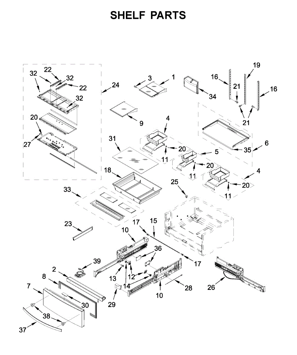 Interior glass shelf for bottom-mount refrigerators. Replaces cracked, broken, or missing shelves to restore usable storage space in your fridge.
