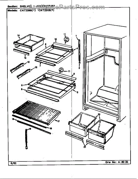 The crisper shelf center support stabilizes the pan cover above the crisper drawers to keep it level under load. Replace a cracked or missing support to restore proper shelf alignment and smooth crisper drawer operation.