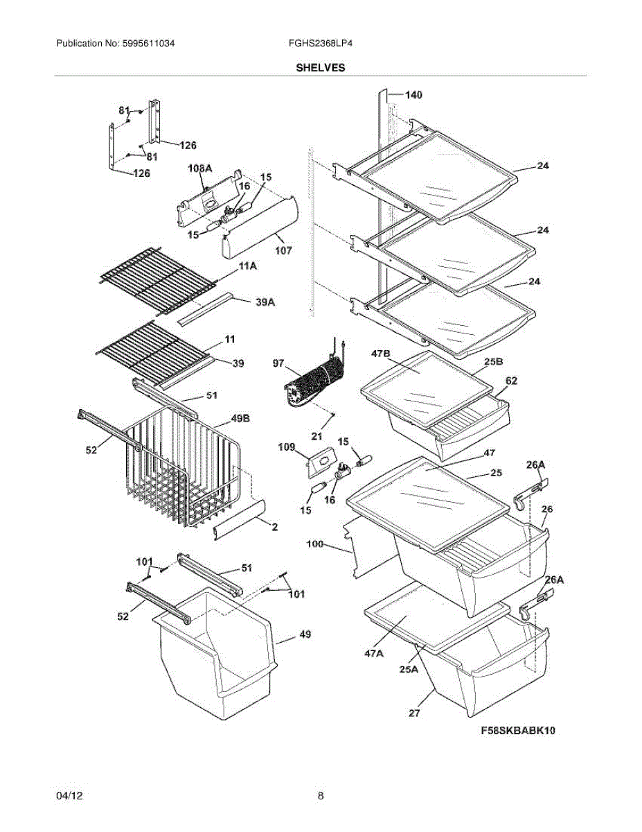 This shelf and trim assembly replaces a damaged or worn refrigerator shelf trim to restore a secure shelf edge and improve storage stability. It provides the finished trim piece that retains items and keeps the shelf seated correctly. What it does: