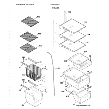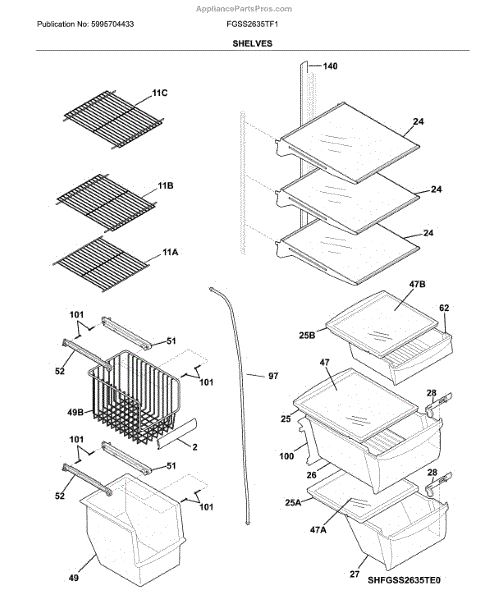The Shelf is an OEM replacement part for Frigidaire refrigerators. It provides flexible storage and organization for items inside the refrigerator. Shelves are essential for maximizing interior capacity and accommodating groceries of various heights and sizes. Causes of a bad shelf can include wear and tear over time, damage from excessive weight, or accidental breakage. Handles might loosen or cracks could develop in the surface. Symptoms of a bad shelf include:
