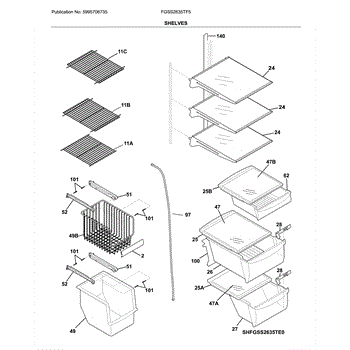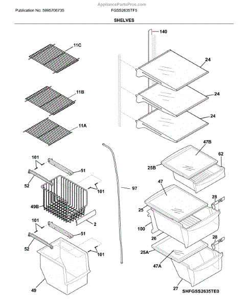The Shelf is an OEM replacement part for Frigidaire refrigerators. It provides flexible storage and organization for items inside the refrigerator. Shelves are essential for maximizing interior capacity and accommodating groceries of various heights and sizes. Causes of a bad shelf can include wear and tear over time, damage from excessive weight, or accidental breakage. Handles might loosen or cracks could develop in the surface. Symptoms of a bad shelf include: