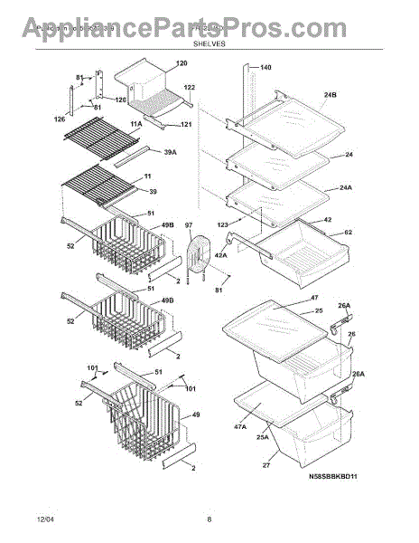 This shelf and trim assembly replaces a damaged or worn refrigerator shelf trim to restore a secure shelf edge and improve storage stability. It provides the finished trim piece that retains items and keeps the shelf seated correctly. What it does: