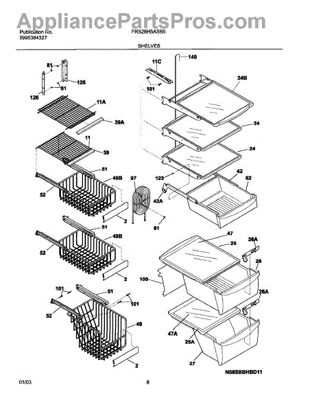 Upper sliding basket for refrigerator storage organization. Replaces cracked, broken, or missing baskets. Installs in upper freezer compartment.