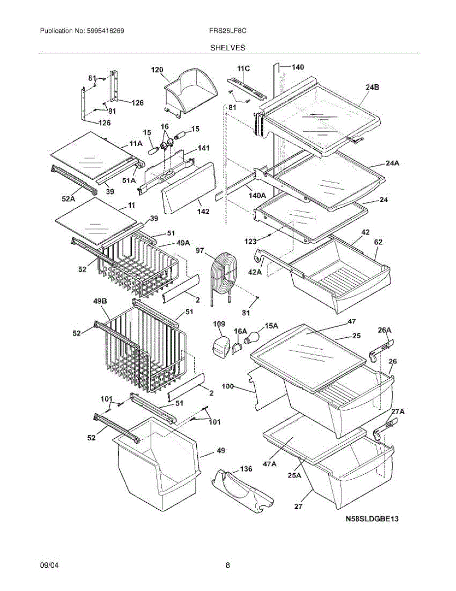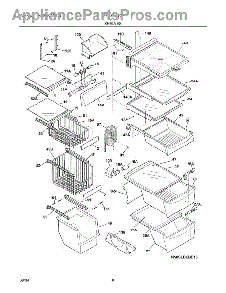 Glass shelf for side-by-side refrigerators. Provides durable storage surface inside fresh food compartment. Replace if cracked, broken, or missing.