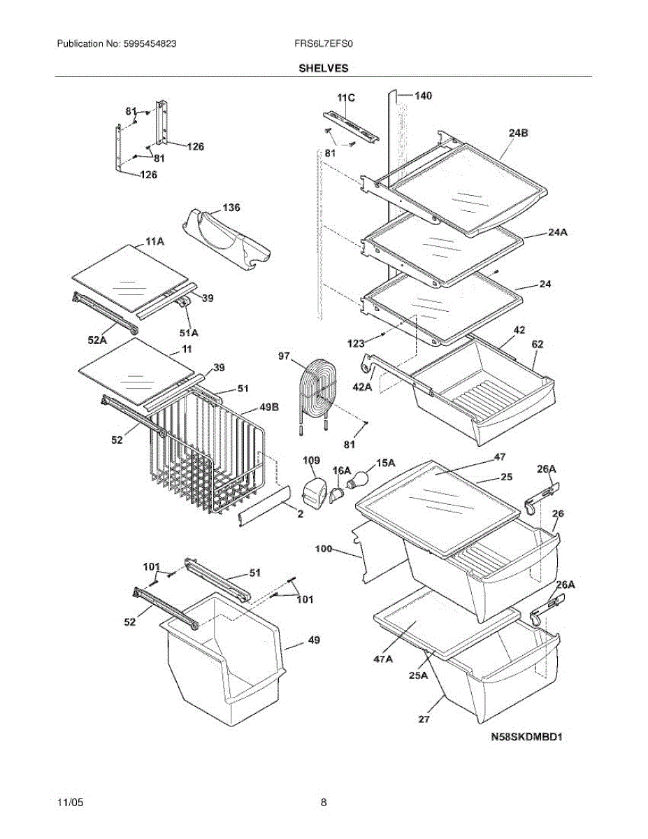 Over time, the glass shelf can become damaged due to heavy items being placed on it, accidental impacts, or thermal stress from temperature changes. Replacing a damaged shelf ensures safe and effective storage inside the refrigerator.