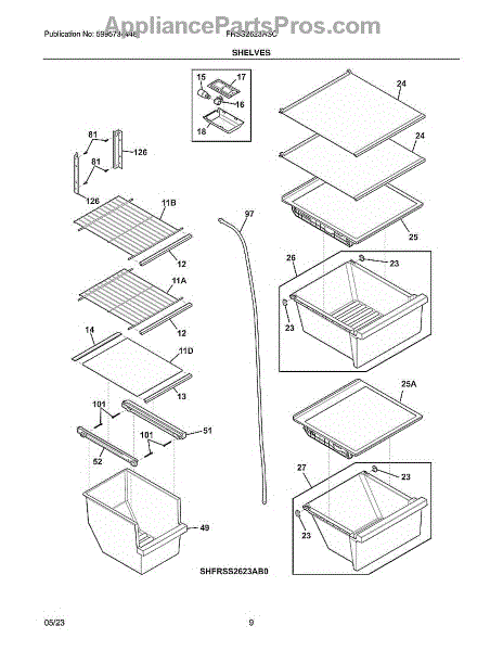 The Shelf Assembly is an OEM part for Frigidaire side-by-side refrigerators. It includes the glass shelf surface.