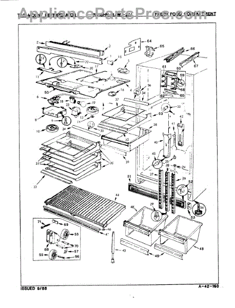 The crisper shelf center support stabilizes the pan cover above the crisper drawers to keep it level under load. Replace a cracked or missing support to restore proper shelf alignment and smooth crisper drawer operation.
