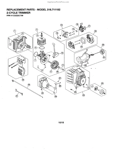 This is a short block assembly for a string trimmer. The short block consists of many of the engine components, including the cylinder and crank case, the piston and connecting rod, the crankshaft, the flywheel, the spark plugs, and the ignition module. This is a genuine OEM part and is sold individually. This assembly is compatible with Craftsman, Murray, Troy-Bilt, and Yard Man.A problem with any of the components of the engine will cause issues. For major failure of multiple components, the short block assembly contains all parts needed to repair the entire engine. Getting to the short block assembly requires taking the machine apart piece by piece. When removing the crankshaft, insert a 20-inch length of starter rope into the spark plug hole onto the piston, leaving some for removal. Using a wrench, rotate the clutch until the piston moves up and catches the rope, binding it and locking the crankshaft. When installing the new ignition module, be sure to use a spark plug gap spacer to ensure the proper gap between it and the magnets on the flywheel.