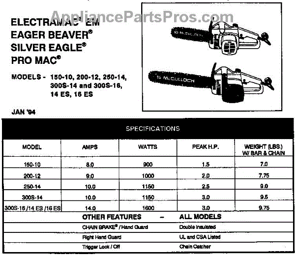 Parts for Mcculloch ELECTROMAC EM: Specifications Parts