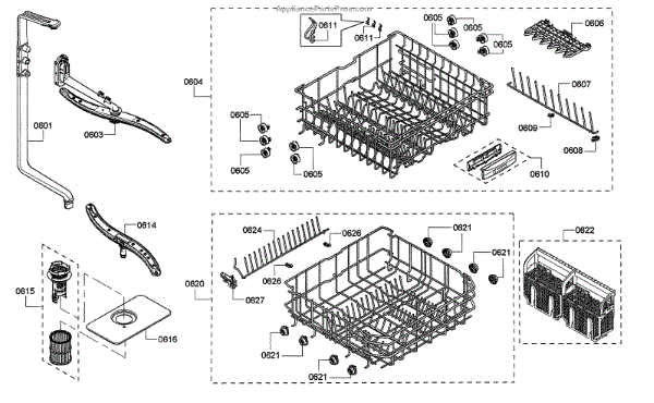 The Upper Dishrack Assembly is an OEM replacement part for Bosch dishwashers. Causes of a bad assembly include cracked or broken rack modules from years of abusive slamming during loading. Mineral buildup may also lead to jammed or stuck tines no longer gliding freely between positions. Symptoms of a bad Upper Dishrack include: