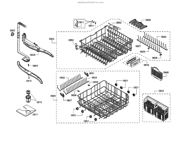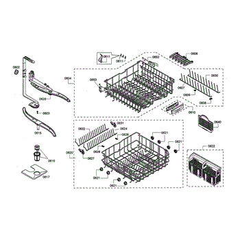 The Upper Dishrack Assembly is an OEM replacement part for Bosch dishwashers. Causes of a bad assembly include cracked or broken rack modules from years of abusive slamming during loading. Mineral buildup may also lead to jammed or stuck tines no longer gliding freely between positions. Symptoms of a bad Upper Dishrack include: