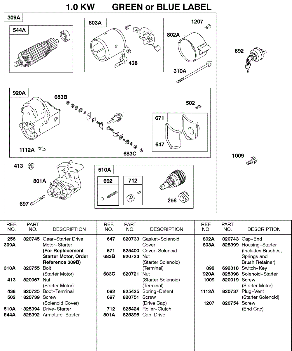 Parts for Briggs & Stratton 580447-0316-99: Starter Motor, 1.0Kw Green Or Blue Label Parts