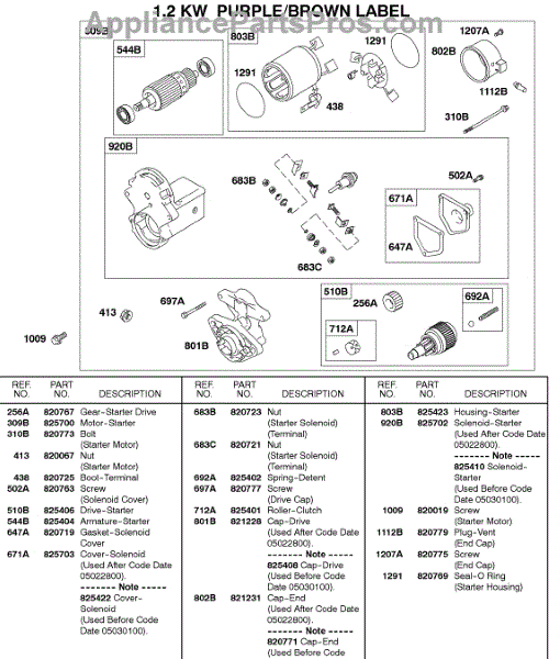 Parts for Briggs & Stratton 580447-0220-E2: Starter Motor, 1.2 Kw Purple Or Brown Label Parts