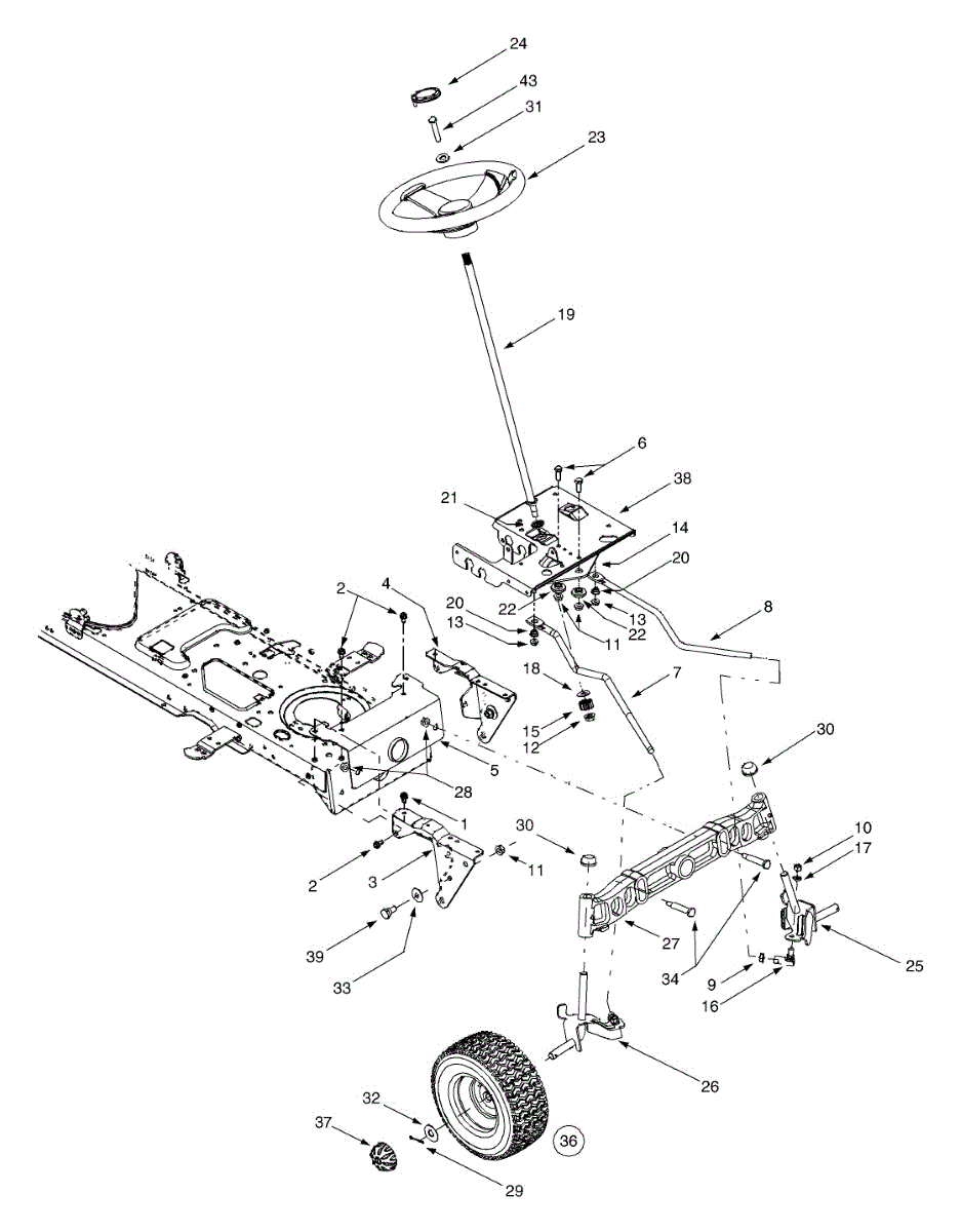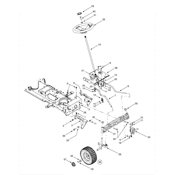 Rear axle assembly connects wheels to the lawn tractor frame for steering and mobility. Replace if bent, cracked, or damaged from wear or impact.