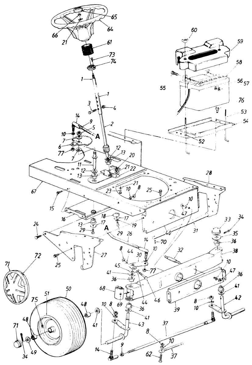 Parts for Turf Pro 142-848H009 / 1992: Steering Assembly, Lower Frame & Battery Parts