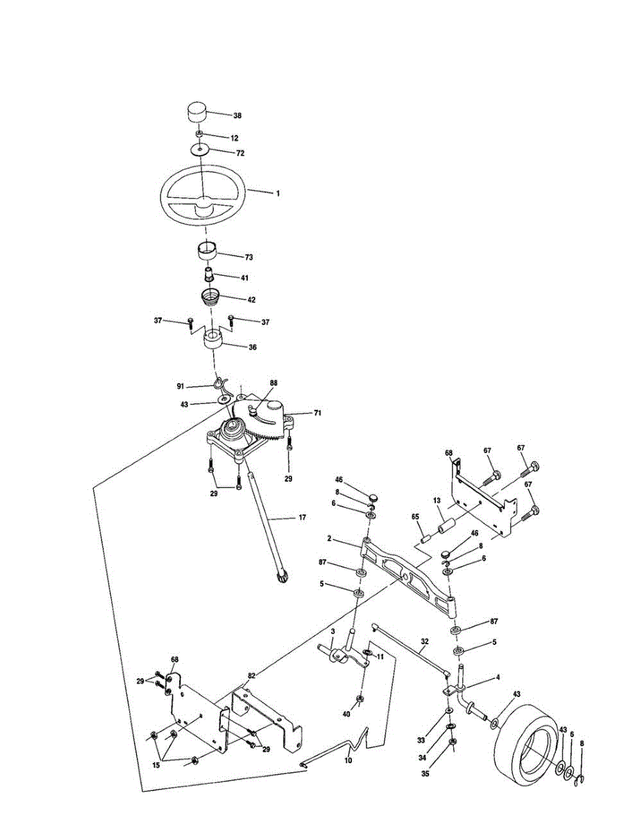 Fix loose or disconnected steering on your riding mower. This steering shaft assembly connects the wheel to the sector gear for precise control.