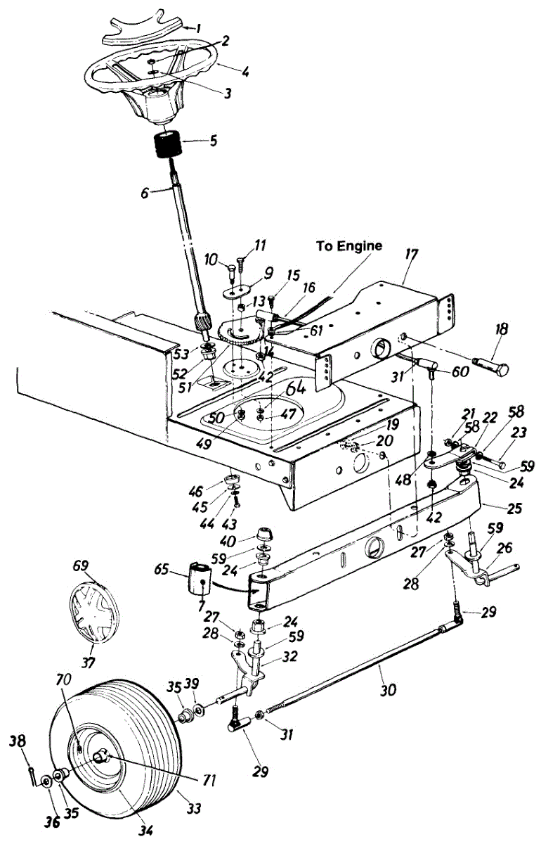 Steering pivot bar for lawn tractors. Connects steering mechanism to wheel assembly. Replace if bar is bent, cracked, or worn from use and impact.