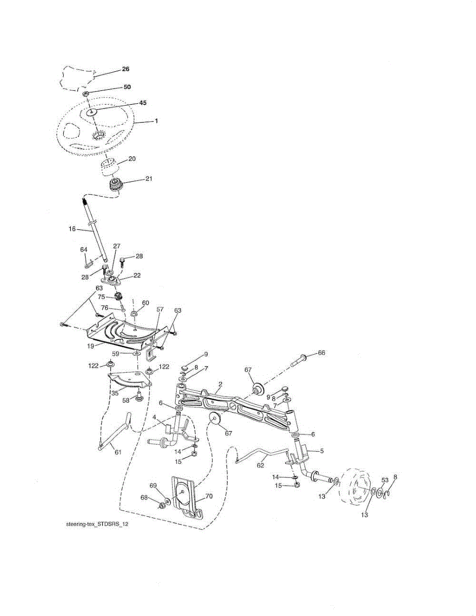 Steering shaft connects the steering wheel to the gearbox on riding mowers and lawn tractors. Replace if bent, cracked, or worn for proper steering control.