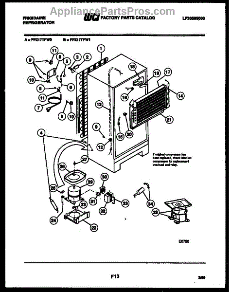 This is a compressor used in several types of home appliances. The compressor is designed to take cold gas in the appliance and place it under pressure so the gas raises in temperature. It is then moved through the refrigerator system to ensure the unit stays cold throughout the appliance. This part can become damaged or malfunction, which may cause the motor to stop running, make the motor noisier, or cause the motor to never stop running.If this happens, the compressor will need to be replaced. A basic set of tools will be needed. A pair of work gloves can also be useful. First, locate the compressor as it may be in various locations depending on the appliance model. Unplug the appliance before removing the compressor. Install the new compressor using the original bolts and nuts before turning the power back on and resuming normal use.This part is sold on an individual basis. The compressor is made to be used with refrigerators, ranges, stoves, ovens, air conditioners, and freezers created by Gibson, Frigidaire, Kelvinator, Montgomery Wards, Westinghouse, Tappan, JCPenney, Universal, and Kenmore. It is an authentic OEM replacement part directly sourced from the manufacturer.